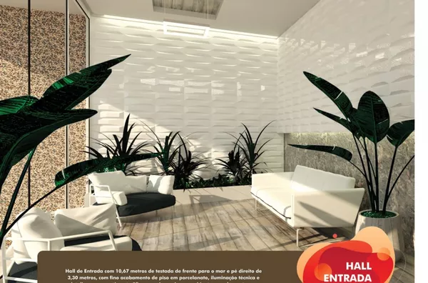 . Hall de Entrada - fino acabamento de piso em porcelanato, iluminação técnica e detalhes em revestimento em 3D ambiente aconchegante com linda vista para o mar;